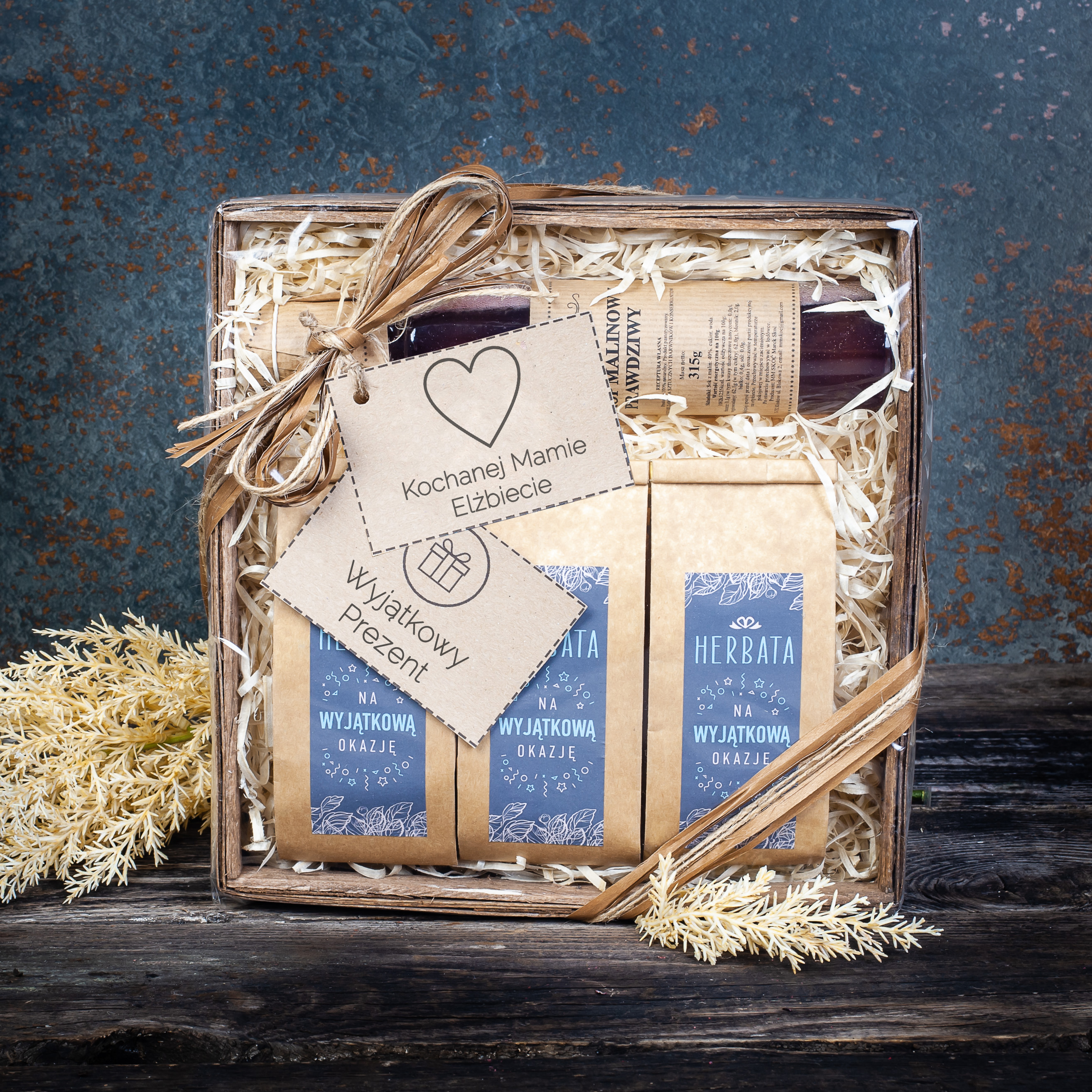 Kosz prezentowy z herbatą i naturalnymi przetworami