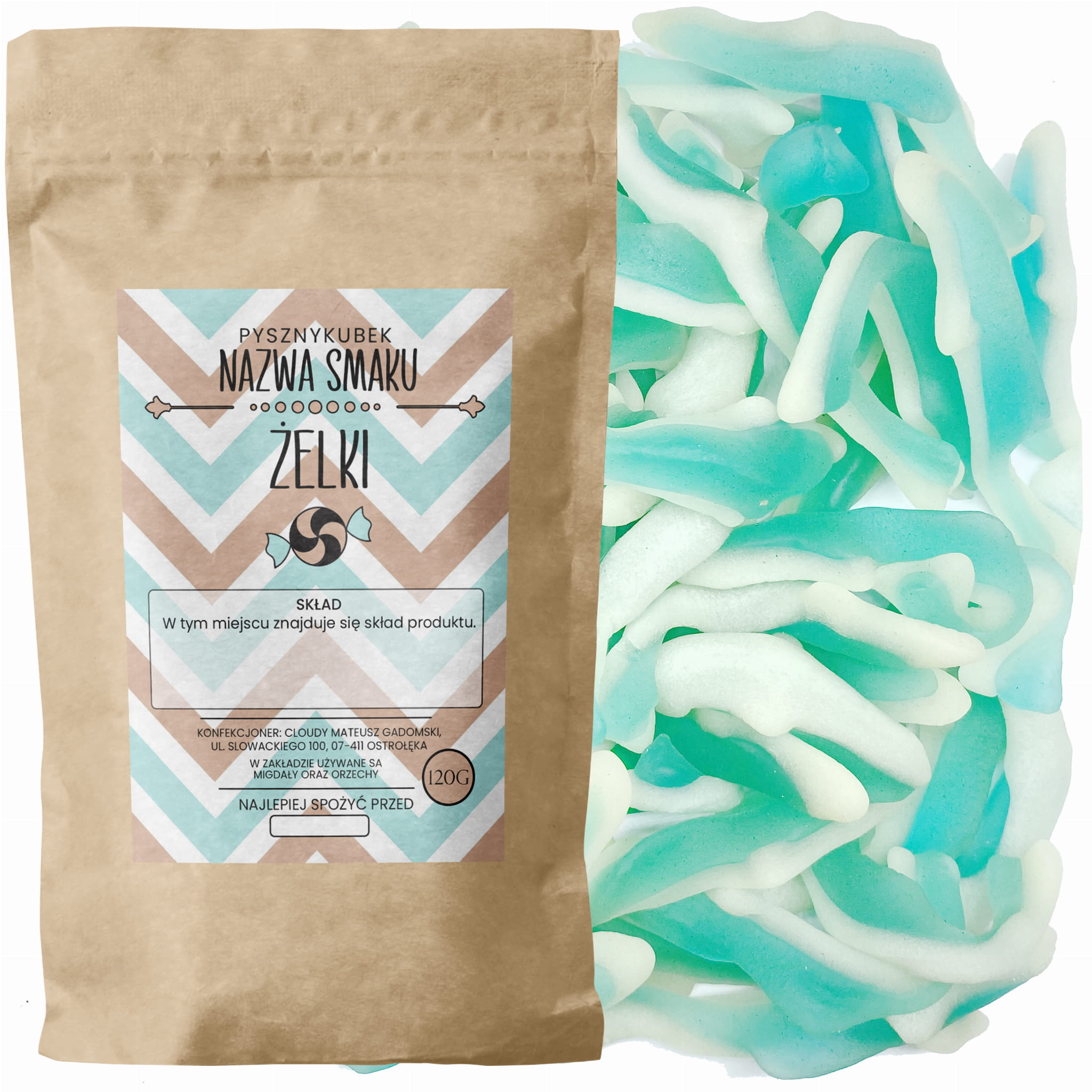 Skład: Cukier, syrop glukozowy, substancja zagęszczająca-żelatyna wieprzowa, regulator kwasowości-kwas cytrynowy, aromaty, barwniki (błękit brylantowy), substancja konserwująca-sorbinian potasu, olej roślinny (rzepakowy). Produkt zawiera mąkę zbożową zawierającą gluten (żyto).