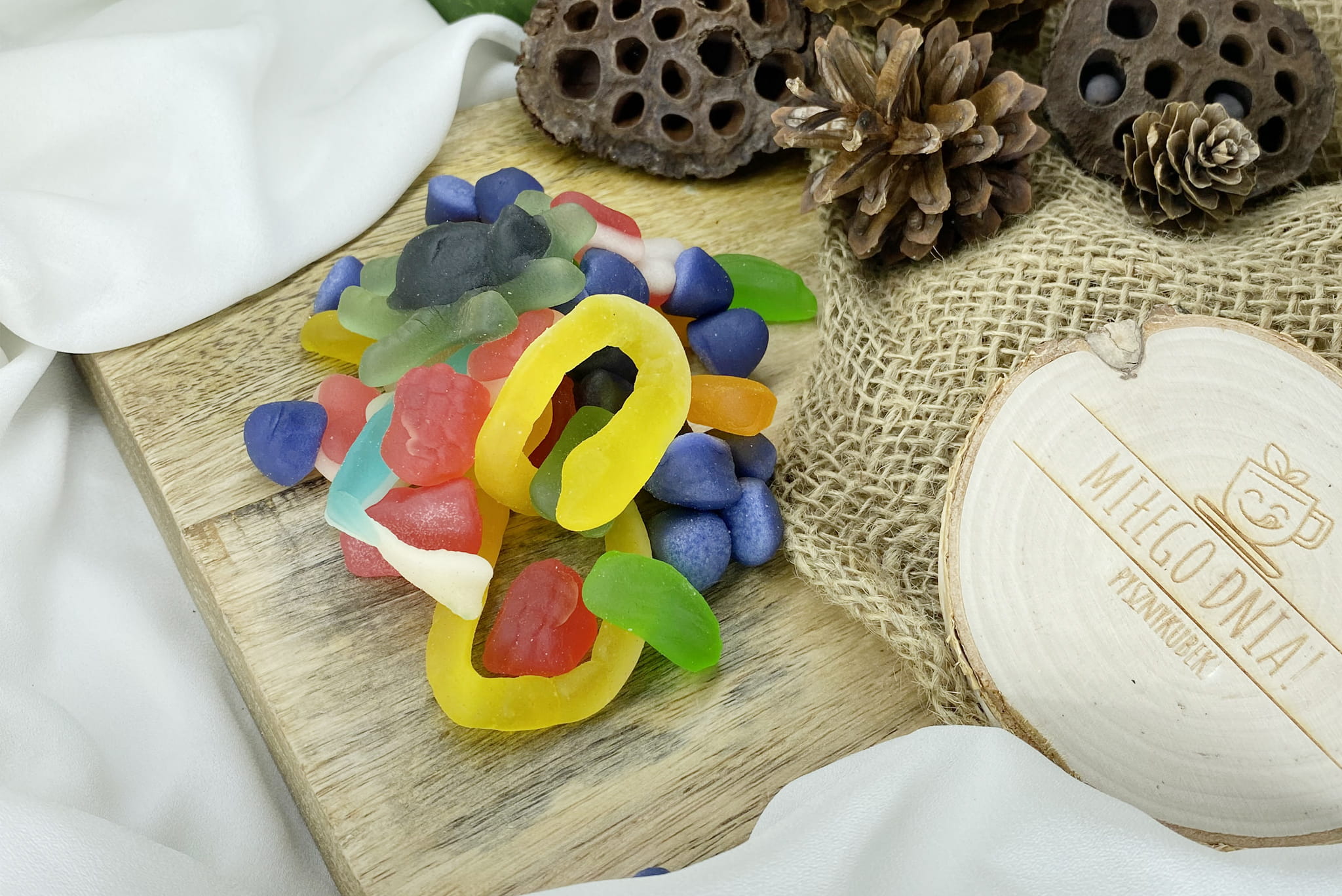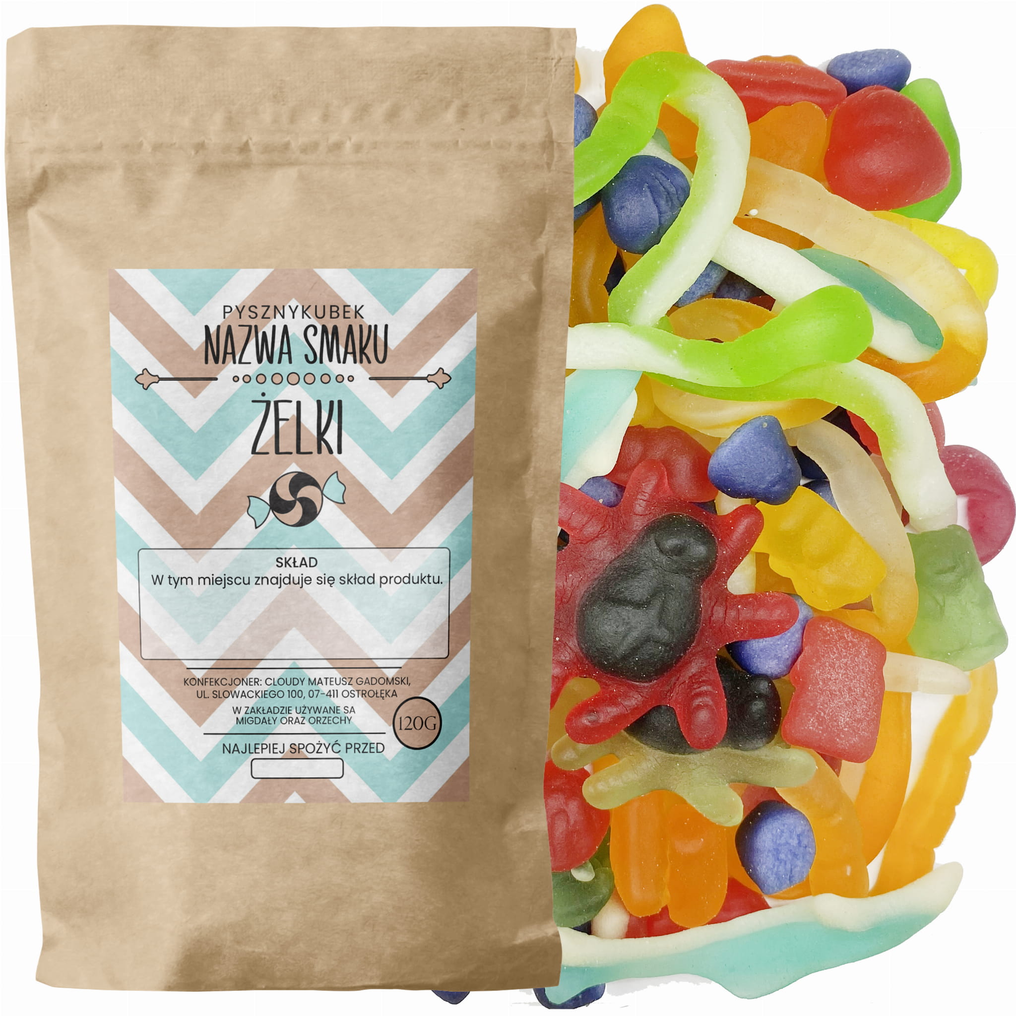 Foliowe opakowanie zawierające 120g najlepszych polskich żelków! Opakowanie zawiera minimum 4 rodzaje żelków z całej oferty firmy. Do mieszanki nie dodajemy żelków anyżowych.